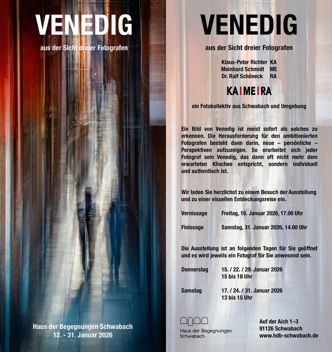 Das KA I ME I RA Fotokollektiv aus Schwabach und Umgebung möchte euch gerne zur Vernissage unserer Ausstellung „VENEDIG aus der Sicht dreier Fotografen“ am Freitag den 16. Januar 2026 um 17.00 Uhr ins Haus der Begegnungen Schwabach einladen. Details zu weiteren Öffnungszeiten und zum Veranstaltungsort findet ihr im beigefügten Flyer.